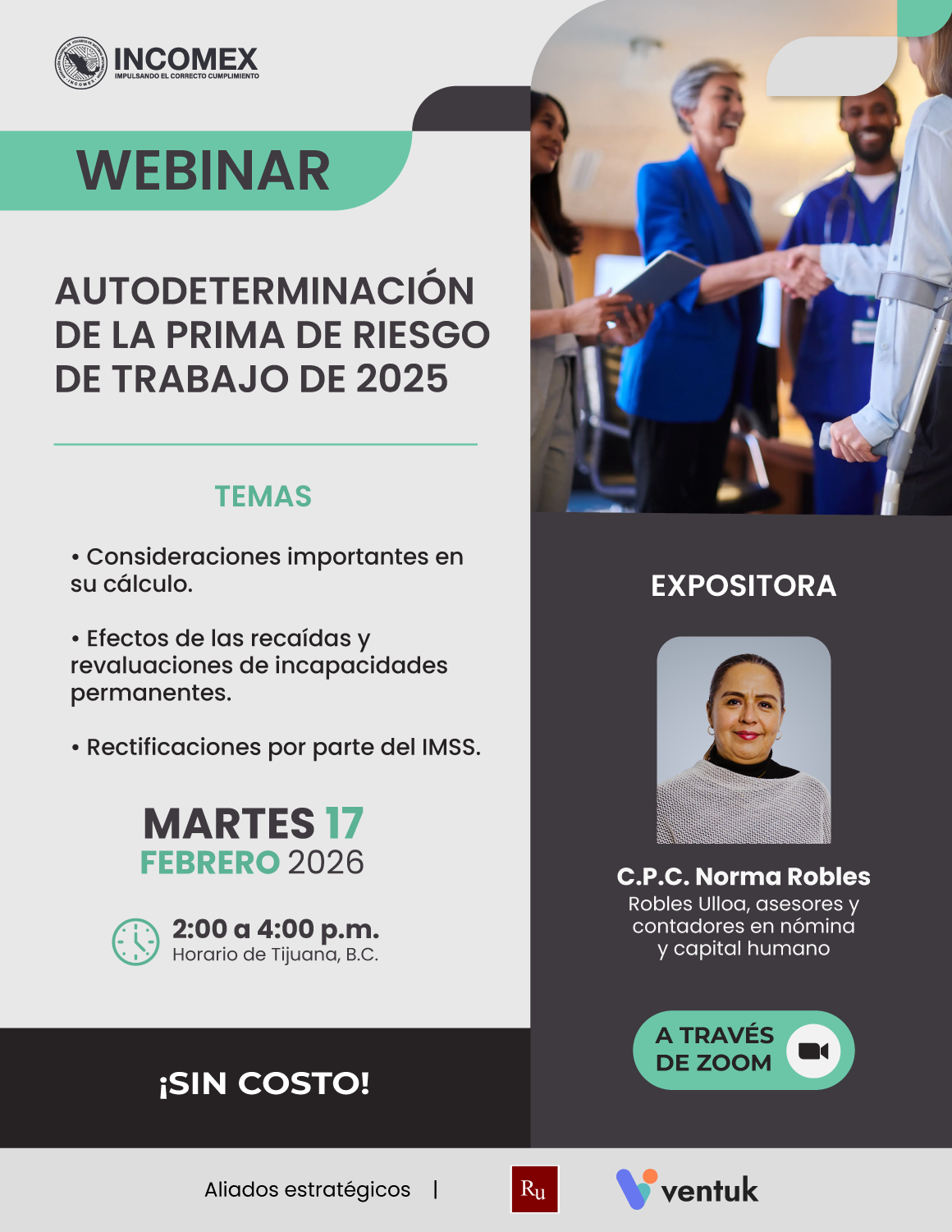 En este webinar, organizado por la Asociación Nacional Incomex, la C.P.C. Norma Robles, de Robles Ulloa, asesores y contadores en nómina y capital humano, abordará las consideraciones más relevantes para su cálculo, los efectos de recaídas y revaluaciones de incapacidades permanentes, así como las rectificaciones que puede realizar la autoridad.