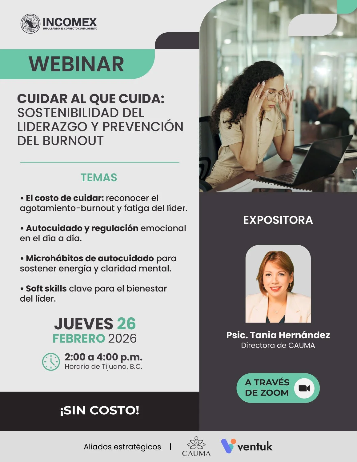 La Psic. Tania Hernández, directora de CAUMA, abordará cómo reconocer señales de burnout y fatiga del líder, así como estrategias de autocuidado, regulación emocional y microhábitos que permitan sostener energía y equilibrio en el día a día.